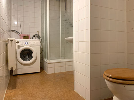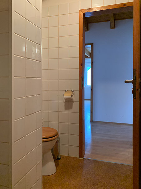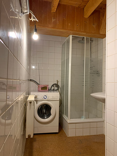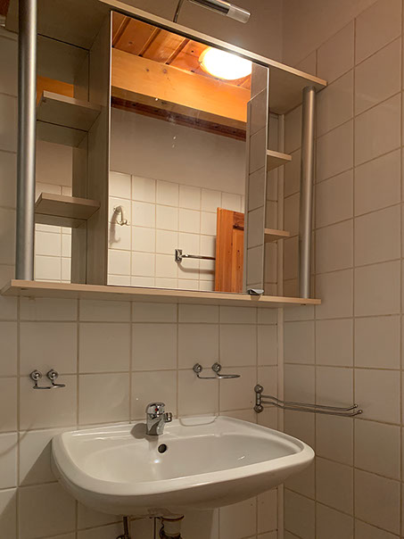 - Bad mit Dusche, Waschbecken (Durchlauferhitzer) und WC